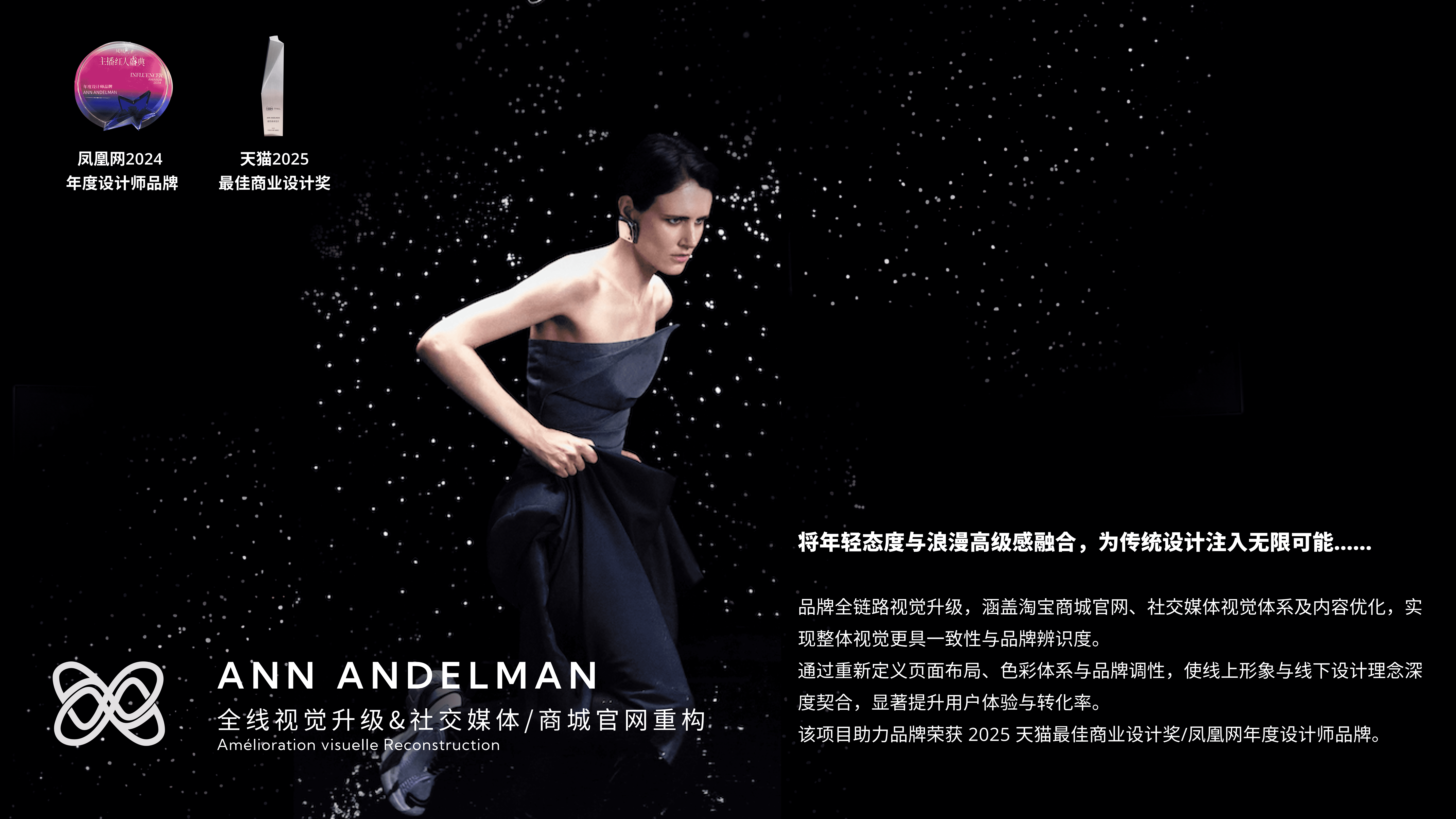 Diaphane Studio led the brand evolution of Ann Andelman, merging youthful attitude with refined French elegance. A cohesive visual system was developed across all touchpoints, from e-commerce to social media, reinforcing clarity and brand recognition.Through a refined approach to layout, color, and visual language, the digital experience was brought into alignment with the brand’s identity.The project contributed to the brand receiving the Tmall Best Commercial Design Award and Ifeng Annual Designer Brand Award. 透相设计为法式品牌 Ann Andelman 提供品牌升级服务,将年轻态度与法式浪漫高级感融合,为既有视觉注入更具当代感的表达。 项目涵盖品牌视觉体系重构及全触点统一,包括电商平台与社交媒体视觉优化,强化品牌识别与整体一致性。通过对版式结构、色彩体系与视觉语言的系统梳理,实现线上体验与品牌调性的统一,提升用户感知与转化表现。 该项目助力品牌获得「天猫最佳商业设计奖」与「凤凰网年度设计师品牌」。
